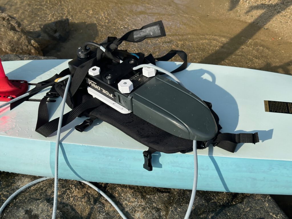Habe vor einer Woche eine erste Version eines Halters für den Rücken und ein langes Kabel produziert. Bin inzwischen 2x mit diesem Setup gefahren. Bin total begeistert vom Ergebnis. Das Board und Foil ist nun so leicht wie noch nie zuvor und fährt sich phantastisch. Das Gewicht auf dem Rücken macht gar nichts aus wie ich finde und trägt eher noch dazu bei dass der Kontakt zum Board an den Fußsohlen besser ist. Jetzt werde ich ein zweites Kabel anfertigen mit Spiralwicklung und weiter testen. Für mich ein echter Zugewinn. Video unter https://www.instagram.com/reel/DPzJLYtDL1S/