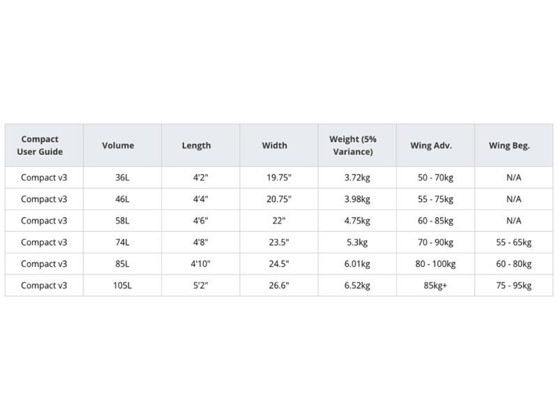 Das Compact Wingboard wurde mit seinem hochkonzentrierten Volumen und dem geringen Schwunggewicht vollständig für das Wing-Fahren optimiert. Die stabile Plattform und das zentralisierte Volumen machen das Board perfekt für fortgeschrittene bis sehr erfahrene Wingboard-Fahrer bei leichteren Bedingungen. Es lässt sich beim Springen und bei progressiven Manövern leicht herumwerfen. Die hohe Apex-Schiene vermittelt das Gefühl eines schmalen Boards, wobei die zusätzliche Breite für Stabilität sorgt, wenn das Board nicht gleitet.