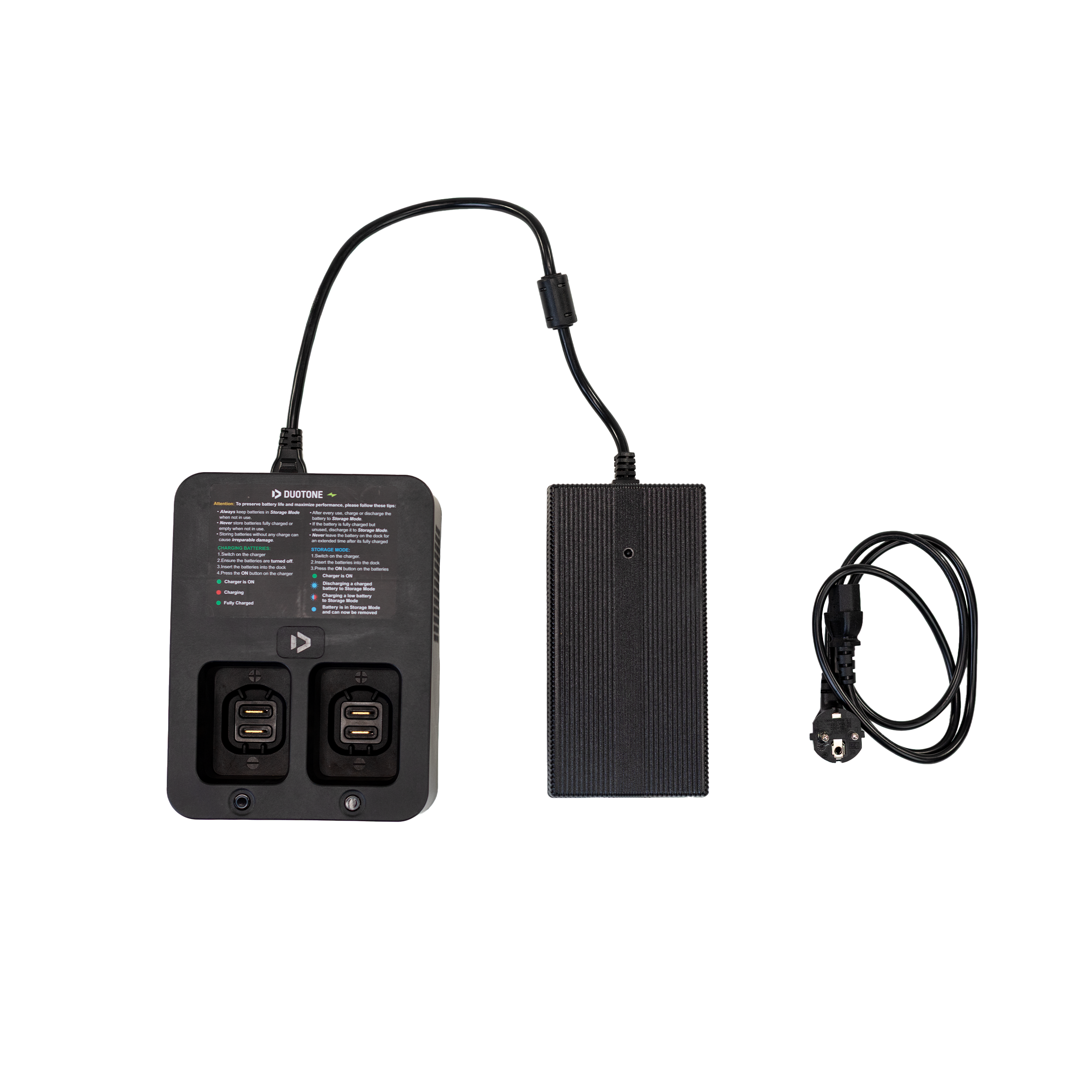Das Ladegerät ist speziell für die Foil Assist Batterien konzipiert und kann bis zu zwei Batterien gleichzeitig aufnehmen. Wenn du die Batterien an diesem Tag nicht mehr verwenden möchtest, empfehlen wir, sie auf etwa 50% (2-3 LED-Leuchten) zu laden oder zu entladen. So verhinderst du eine Überentladung und sorgst dafür, dass sie lange halten. Ein weiterer Vorteil dieses Ladelevels ist, dass du weniger Zeit benötigst, um die Batterien vollständig aufzuladen. Das Ladegerät-Set umfasst eine Dockingstation und ein Adapterkabel. Die Dockingstation verfügt über nur drei Tasten, was die Bedienung sehr einfach macht. Auf ihr findest du einen Anleitungsticker, der dir erklärt, wie du die Batterien lädst oder entlädst. Die Anzeigeleuchten sowie die blinkenden LED-Lichter auf den Batterien informieren dich darüber, ob die Batterien geladen oder entladen werden und wie hoch ihr Ladelevel ist. Damit du das Ladegerät bequem in deine Steckdose stecken kannst, wird es mit einem passenden Stecker für deine Region geliefert (EU, USA, Australien und Vereinigtes Königreich).