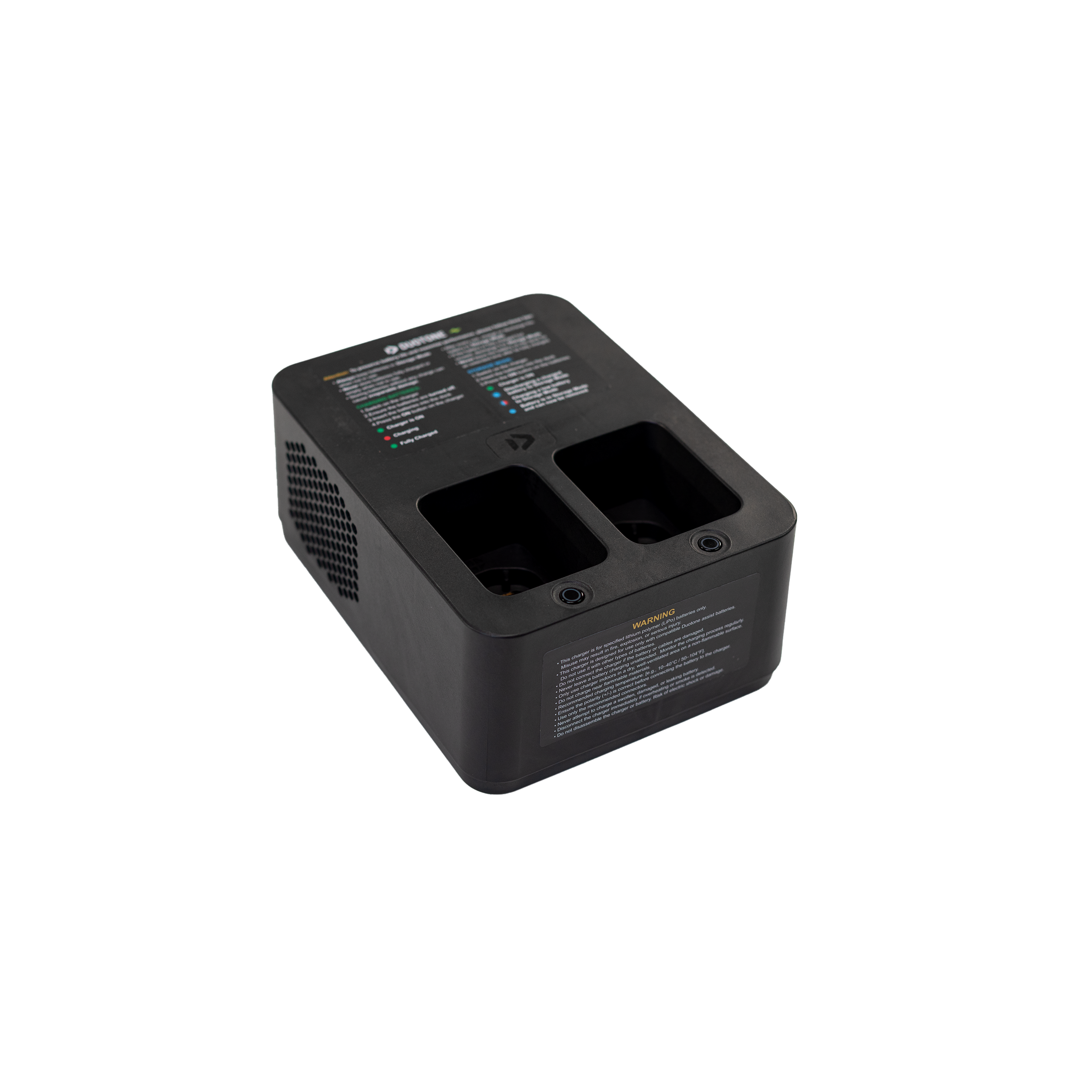 Sie verfügt über nur drei Tasten, was die Bedienung sehr einfach macht: einen Ein/Aus-Schalter auf der Rückseite und zwei Tasten an der Oberseite, die mit einer mehrfarbigen Anzeigeleuchte ausgestattet sind. Diese zeigt an, ob die Batterien gerade laden, entladen oder vollständig aufgeladen sind. Ein praktischer Anleitungsticker auf der Oberseite bietet hilfreiche Hinweise zur Verwendung des Ladegeräts.