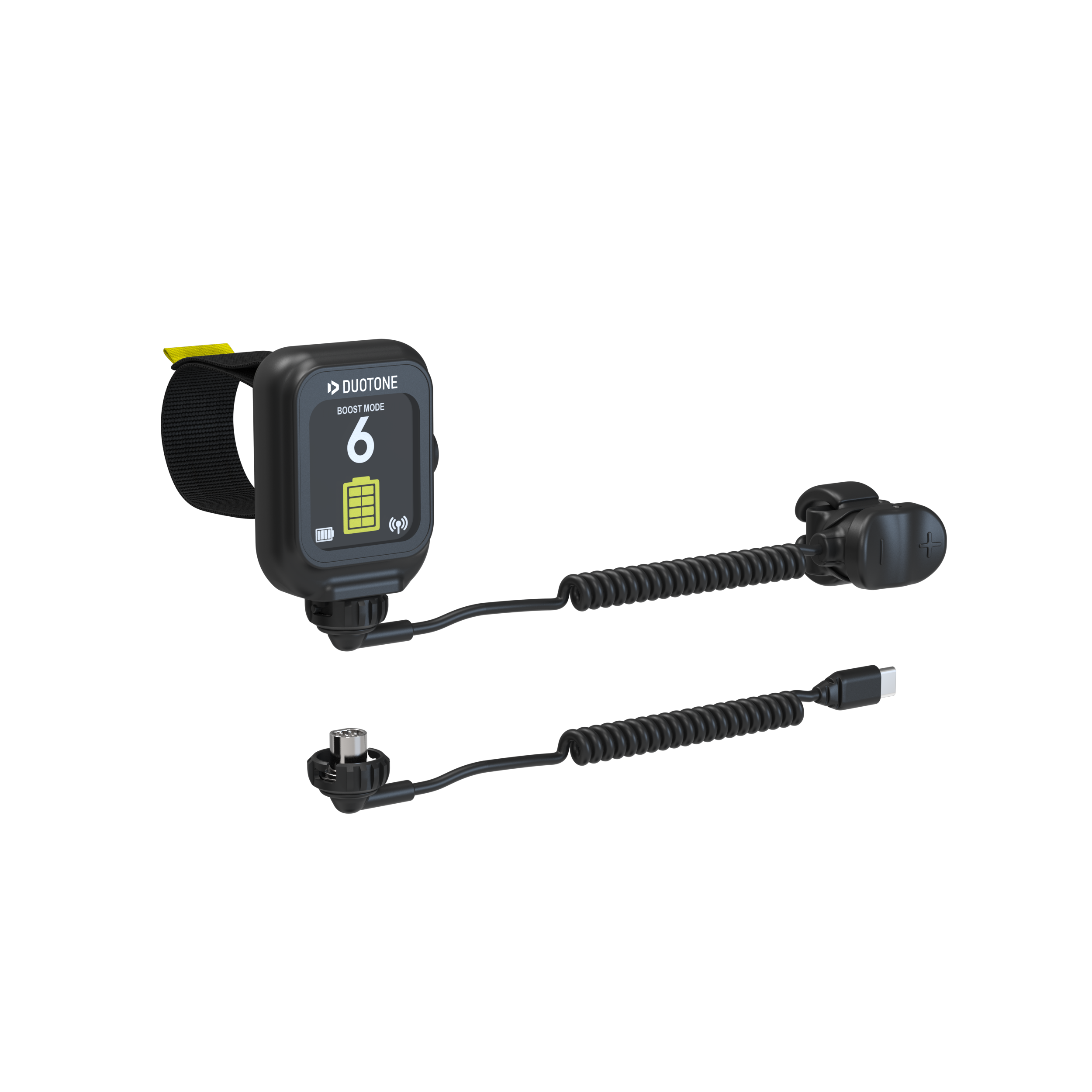Dieses durchdachte Design ermöglicht es dir, deine Hände freizuhalten, während du dich vom Board hochdrückst, paddelst, duckdivest oder den Boom deines Wings greifst. Die Fernbedienung ist intuitiv zu bedienen und gewährleistet zusammen mit dem Empfänger in der Batteriebox eine zuverlässige Signalübertragung an den ESC bzw. Motor. Das Set beinhaltet: * Uhr mit Klettverschlussarmband * Ringcontroller * Ersatz-Ringkabel * USB-C-Ladekabel (ohne Netzteil) * XL-Ersatzarmband * Zwei dicke Ringpolster für einen kleineren Zeigefinger Mit der Uhr kannst du folgende Parameter überwachen: * Geschwindigkeitslevel: 0 – 7 * Batteriestatus des Foil Assists * Batteriestatus der Fernbedienung * Verbindungsstatus: Überprüfe auf einen Blick, ob deine Fernbedienung mit den Batterien verbunden ist. * Einstellung: Sieh, ob deine Fernbedienung im Standard-Modus (5 Geschwindigkeitslevel, energiesparend) oder im Boost-Modus (7 Geschwindigkeitslevel, energieintensiv) eingestellt ist. * Sperre: Das Schloss-Symbol zeigt an, ob die Fernbedienung gesperrt oder entsperrt ist. Mit den + und – Tasten des Ringcontrollers kannst du deine Geschwindigkeit einfach anpassen. Halte die + oder – Taste gedrückt, um eine bestimmte Geschwindigkeit beizubehalten. Um den Motor zu stoppen, lasse einfach den Ringcontroller los. Deine Sicherheit hat für uns oberste Priorität. Die Fernbedienung ist mit einem Doppel-Klick-Sicherheitsmechanismus ausgestattet. Um den Motor zu aktivieren und von Geschwindigkeit 0 auf Geschwindigkeit 1 zu wechseln, musst du die + Taste am Ringcontroller doppelt drücken. Dies verhindert, dass der Motor durch versehentliche Klicks aktiviert wird. Um den Motor während der Nutzung des Foil Assist zu stoppen, lasse einfach den Ringcontroller (+ oder – Taste) los. Wir empfehlen, das Loslassen des Ringcontroller am Anfang mehrmals zu üben, um bei einem Sturz den Motor sofort zu stoppen. Bitte beachte, dass das Signal verloren gehen kann, wenn die Fernbedienung unter Wasser ist. Lege deine Hände daher auf den Bug des Boards, wenn du losfährst und aufstehst. In unserem Help Center (https://www.duotonesports.com/en/foiling-electric/more/service/helpcenter?userLanguageSwitch=true&hcUrl=%2Fde-DE%2Farticles%2Ffoil-assist-316774) findest du weitere nützliche Informationen zum Laden und Bedienen der Fernbedienung.