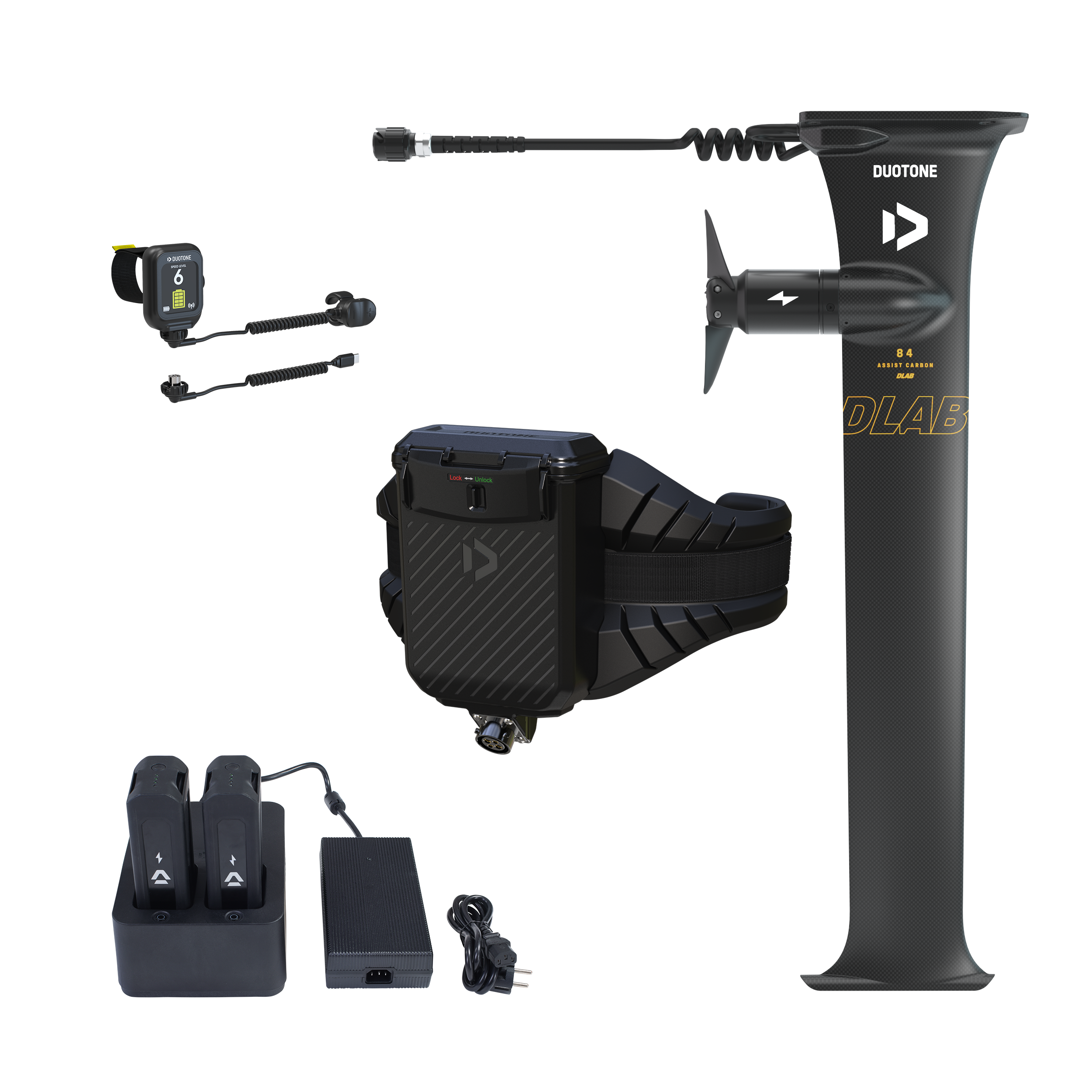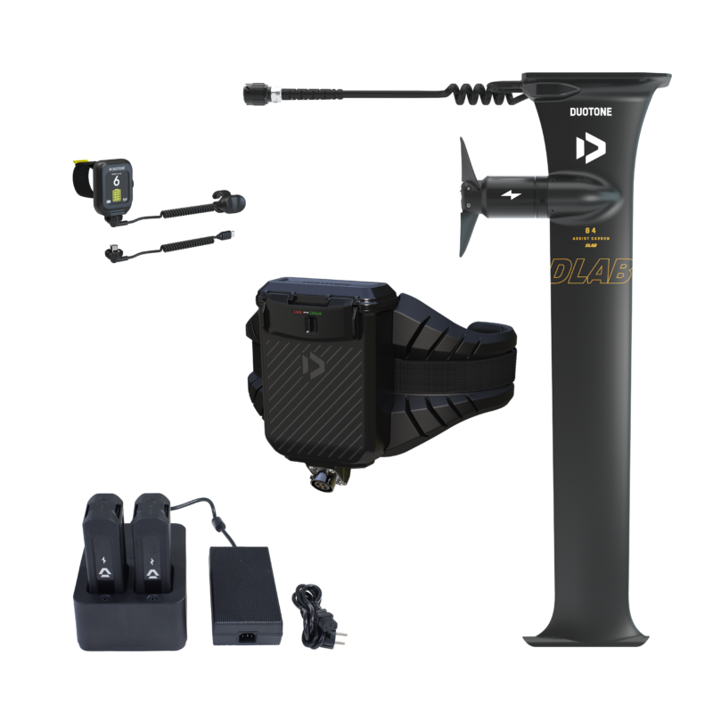Das Foil Assist Set D/LAB enthält folgende Komponenten: eMast D/LAB Set Gefertigt aus leichtem Carbon und 84 cm lang, ist der eMast D/LAB das leichteste und fortschrittlichste Modell unter den Foil Assist Masten. Entwickelt für unvergleichliche Performance und Kontrolle, bietet der D/LAB eMast ein schlankes, strömungsoptimiertes Profil, das verspieltes und präzises Drehen, außergewöhnliche Steifigkeit und maximale Geschwindigkeit ermöglicht. Der Motorpod ist nahtlos in das Mastprofil integriert und 17 cm unterhalb der Top Plate positioniert, wodurch selbst bei Touchdowns kaum Widerstand zu spüren ist. Er verfügt über einen Zweiblatt-Faltpropeller, der müheloses Gleiten auf der Welle ermöglicht. Dank des integrierten Getriebes entfaltet sich der Propeller sofort, sodass der Übergang beim Verlassen der Welle und wieder Beschleunigen sehr sanft verläuft. Der eMast wird wie ein herkömmlicher Foil Mast an Board und Fuselage montiert und ist mit den meisten Foilboards kompatibel. Tipp: Für optimale Batterieleistung kombiniere den eMast mit einem Frontwing von mindestens 900 cm² und einem Board mit einem Volumen von mindestens 35 L. Hinweis: Der eMast D/LAB verfügt über eine 3BS-Verbindung und ist nur mit Duotone Foils und in Kombination mit der speziell entwickelten Fuselage mit Armstrong Foils kompatibel. eTrapez Set Die Energie für den Foil Assist kommt von zwei kompakten Batterien, die in einer wasserdichten Box an einem leichten eTrapez (ca. 3,76 kg) untergebracht sind. So bleibt dein Board frei von zusätzlichem Gewicht und Widerstand. Durch die Platzierung der Batterien auf deiner Hüfte bleibt das natürliche, flowige Foil-Gefühl erhalten, während du immer noch volle Bewegungsfreiheit hast. Das eTrapez ist auftriebsfähig und leicht abnehmbar. Ein Kabel verläuft sauber entlang der kürzeren Board-Leash und verbindet die Batterien mit dem eMast. Der in der Batteriebox integrierte Empfänger sorgt während deiner gesamten Session für eine stabile und zuverlässige Verbindung zwischen Fernbedienung und Motor. Uhr-Fingerring-Fernbedienung Die Foil Assist Fernbedienung – ein wasserdichter Smartwatch-Controller mit Fingerring – hält deine Hände frei, sodass das Aufstehen, Paddeln, Duck-Diven, Carven oder das Halten des Wings deutlich einfacher ist. Aktiviere den Motor mit einem Doppelklick auf die + Taste und steuere die Geschwindigkeit, indem du die + oder – Taste betätigst und gedrückt hältst. Batterieladegerät Das Ladegerät kann beide Batterien in weniger als einer Stunde vollständig aufladen und verfügt zudem über eine Entladungsfunktion, die die langfristige Lebensdauer der Batterien unterstützt. Flugreisetaugliches Batterie Set Die Foil Assist Batterien liefern abhängig von von deinem Können, Setup und den Bedingungen 30 bis 60 Minuten Laufzeit pro Ladung.