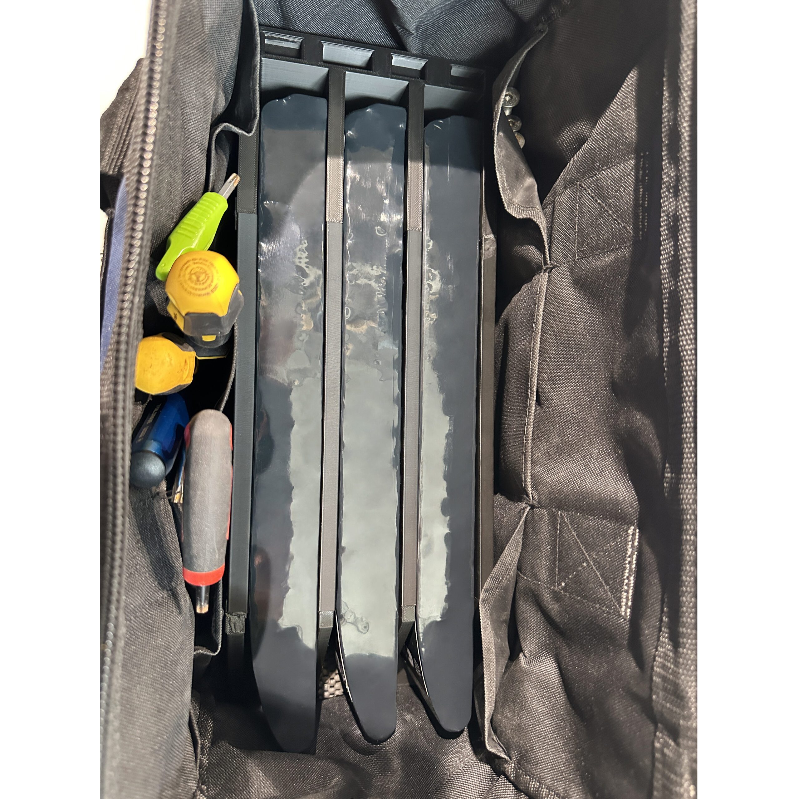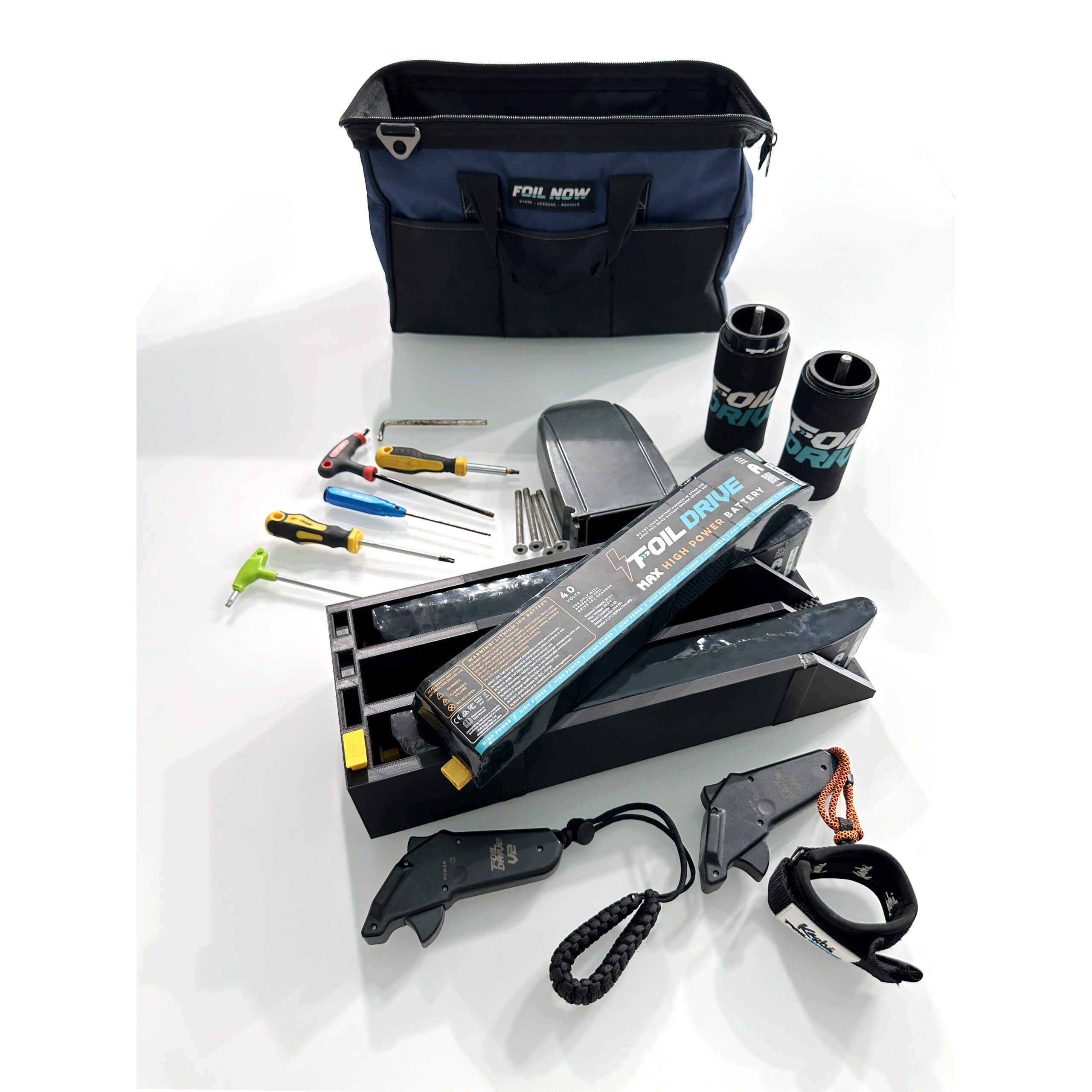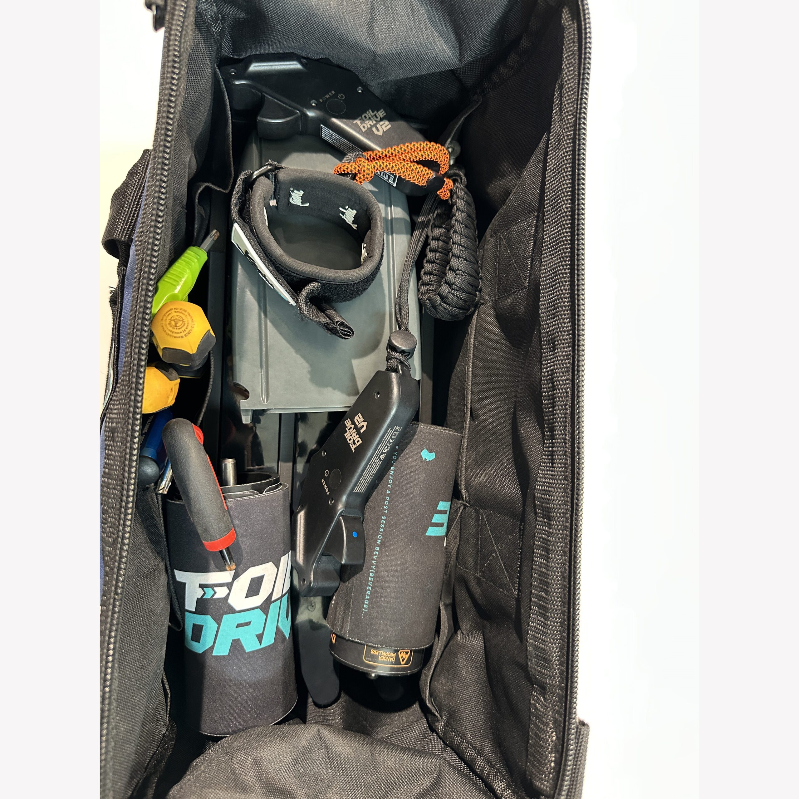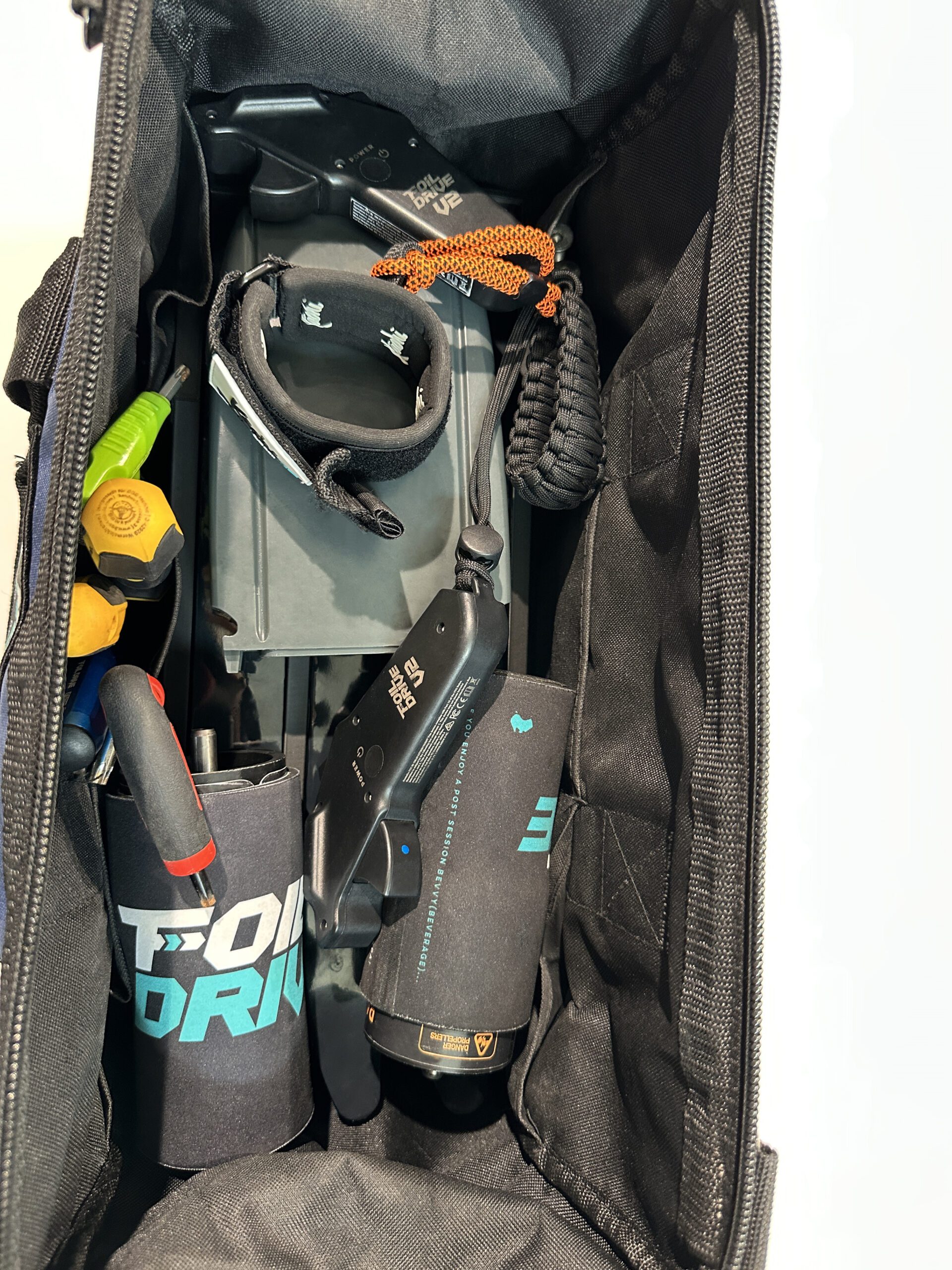 Mehrere Boards, mehrere Foils, Helm, Veste, Neopren….. Der Platz im Auto wird schnell knapp. Dieses Problem war die inspiration für das kreieren dieser kompakten Tasche mit einen stabilen Einsatz für bis zu drei Foil Drive MAX Power Batterien. Die Batterien sind optimal geschützt und der Kunsstoffeinsatz hat platz für des Dielectric Gel und für die gelben Schutzkappen. Außerdem Hast du insgesamt 12 Taschen, 6 innen und 6 außen für Werkzeug, Handy, Schlüssel etc.
